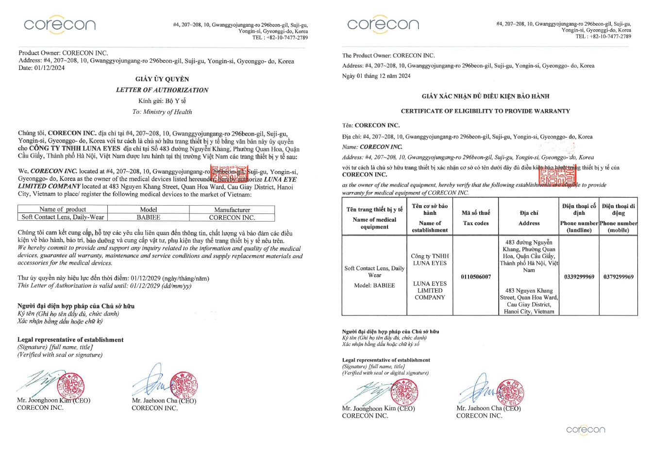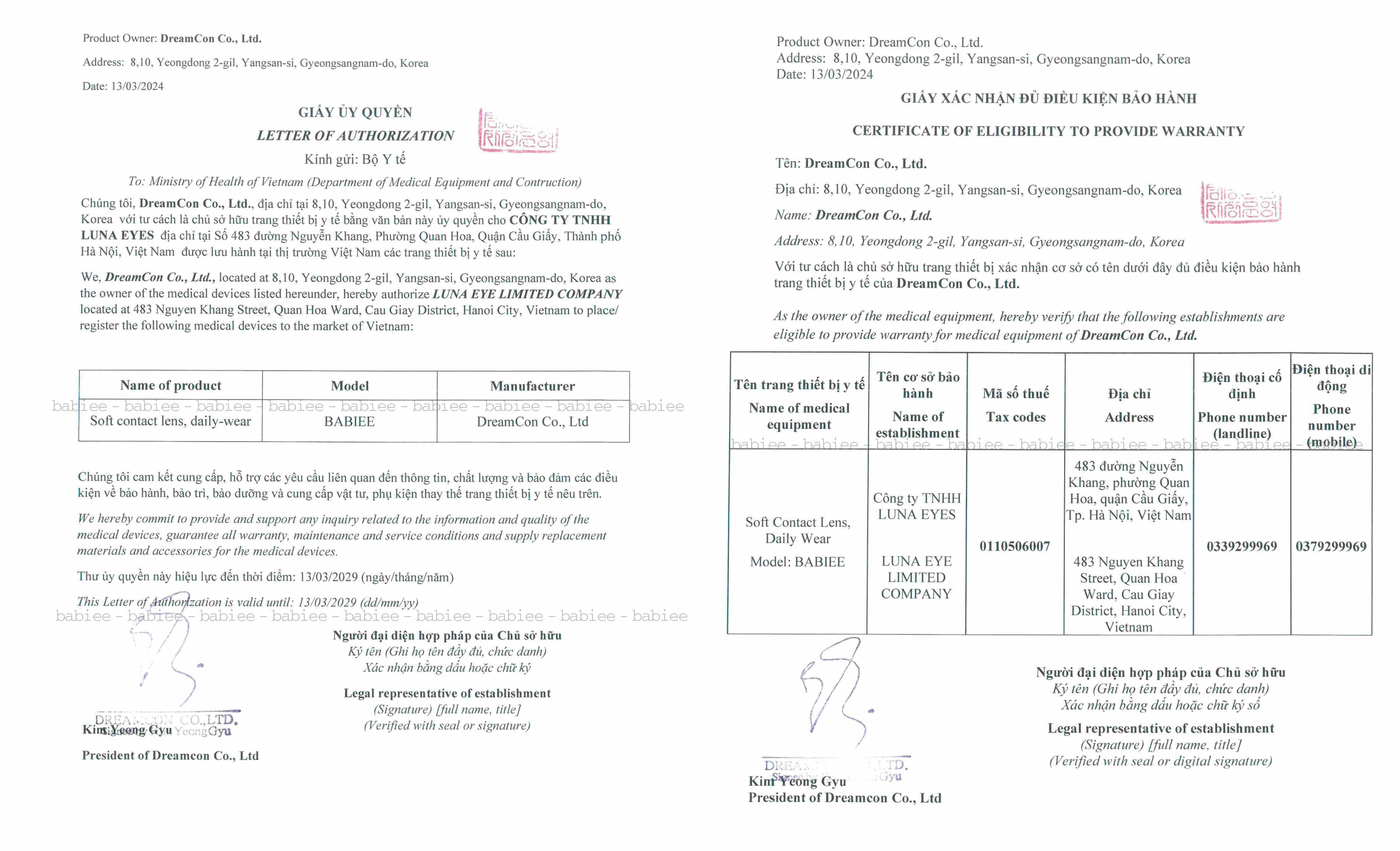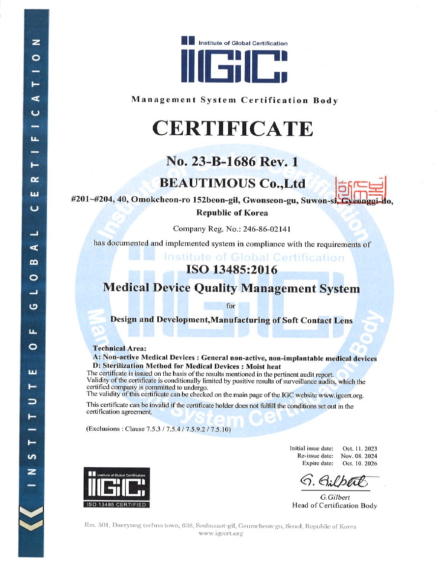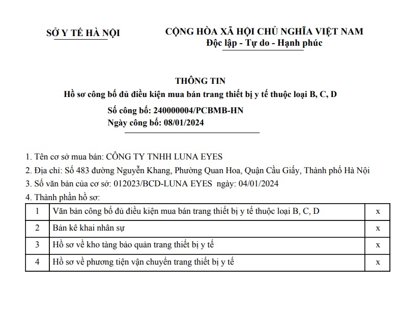 GIẤY CHỨNG NHẬN CHẤT LƯỢNG SẢN PHẨM ĐẠT TIÊU CHUẨN ISO-13485 - LUNA EYES