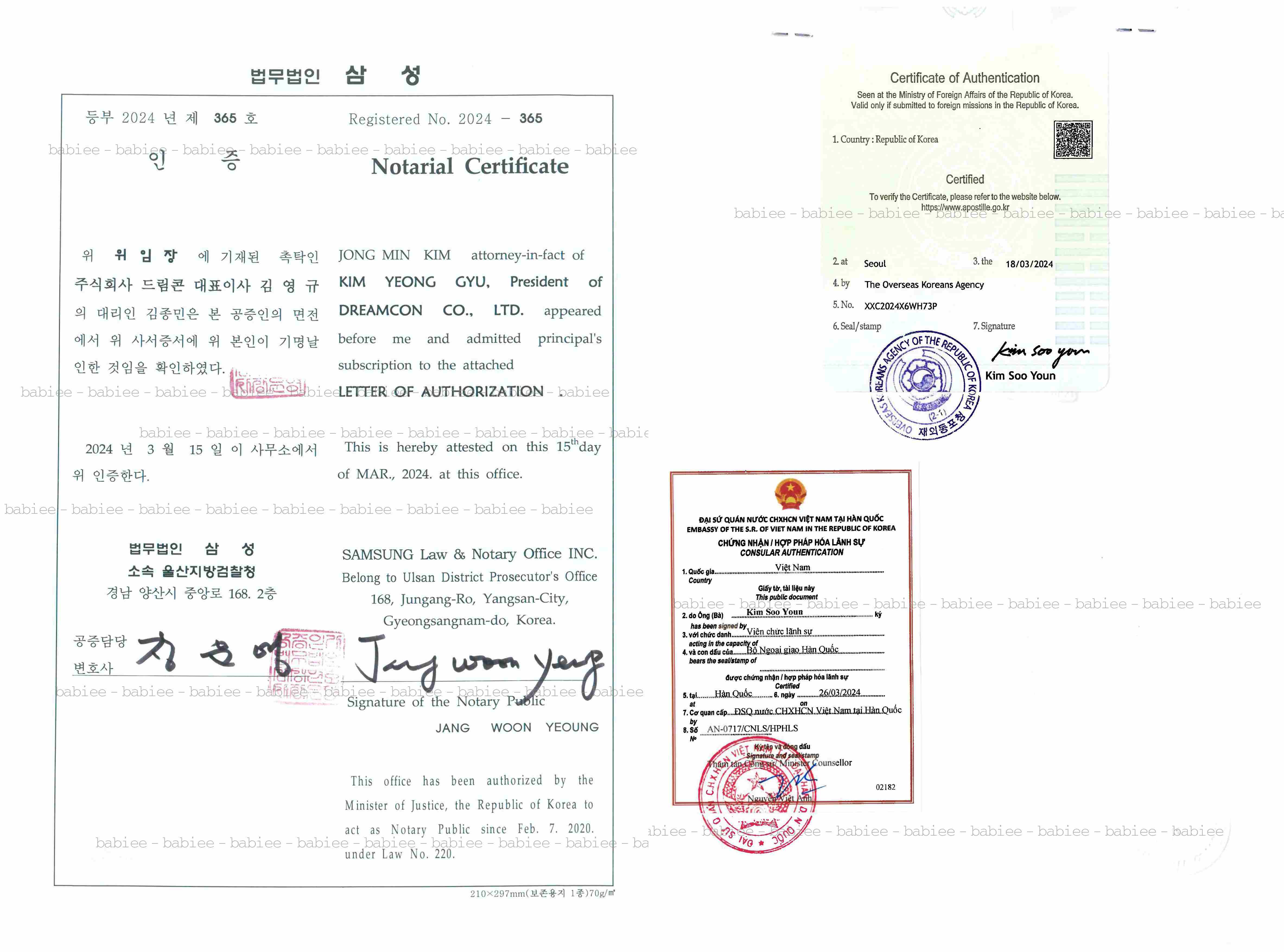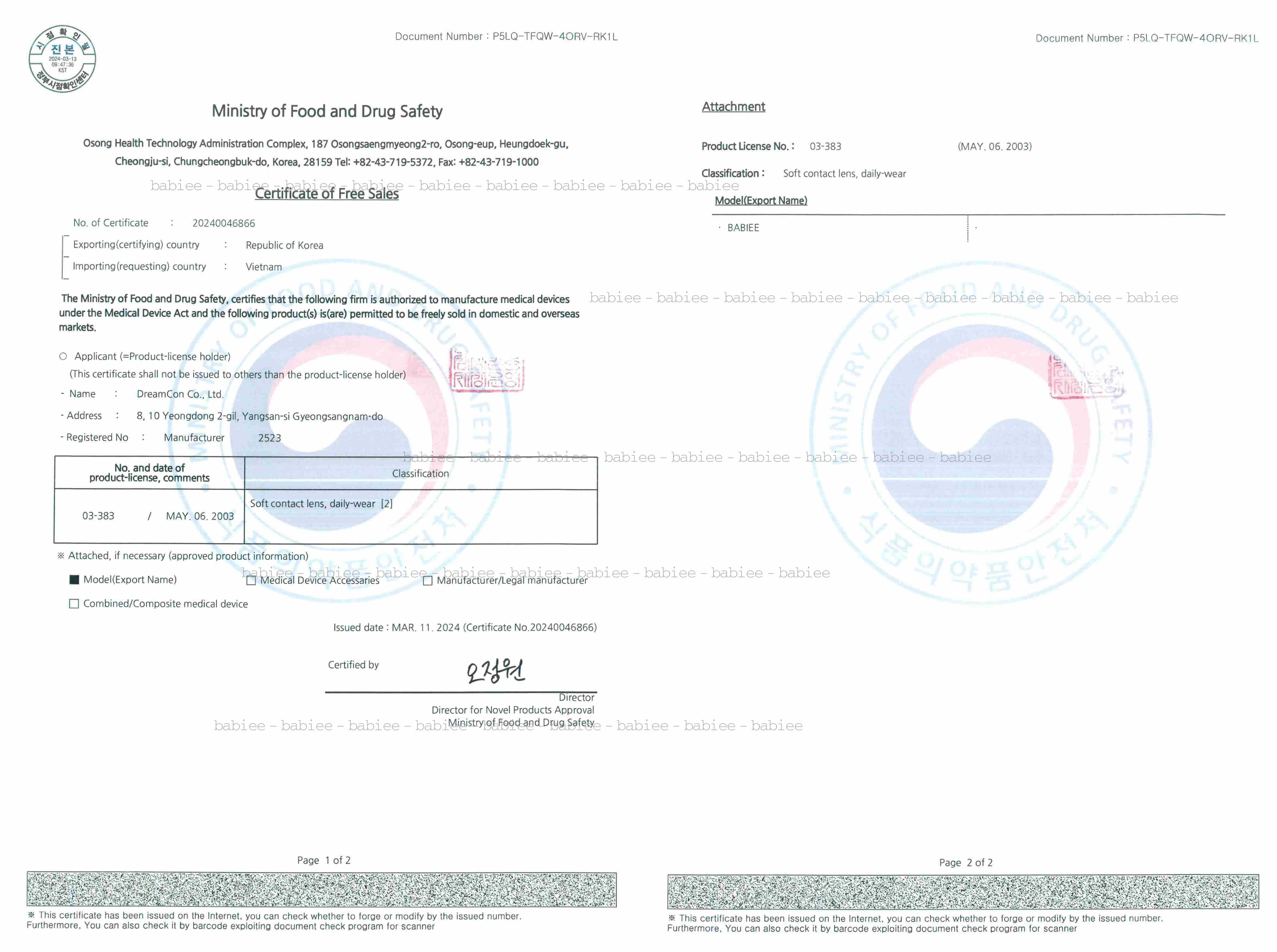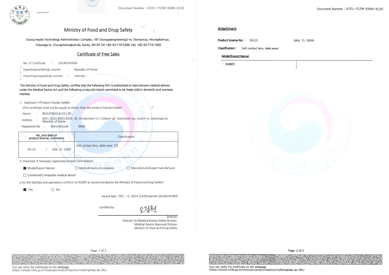CFS: GIẤY CHỨNG NHẬN SẢN PHẨM ĐƯỢC PHÉP LƯU HÀNH TỰ DO GIỮA HÀN QUỐC VÀ VIỆT NAM CỦA BABIEE