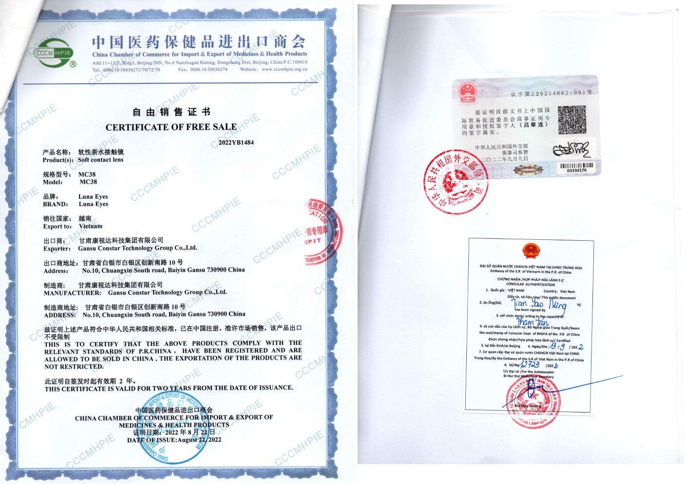 CFS: GIẤY CHỨNG NHẬN SẢN PHẨM ĐƯỢC PHÉP LƯU HÀNH TỰ DO GIỮA TRUNG QUỐC VÀ VIỆT NAM - LUNA EYES