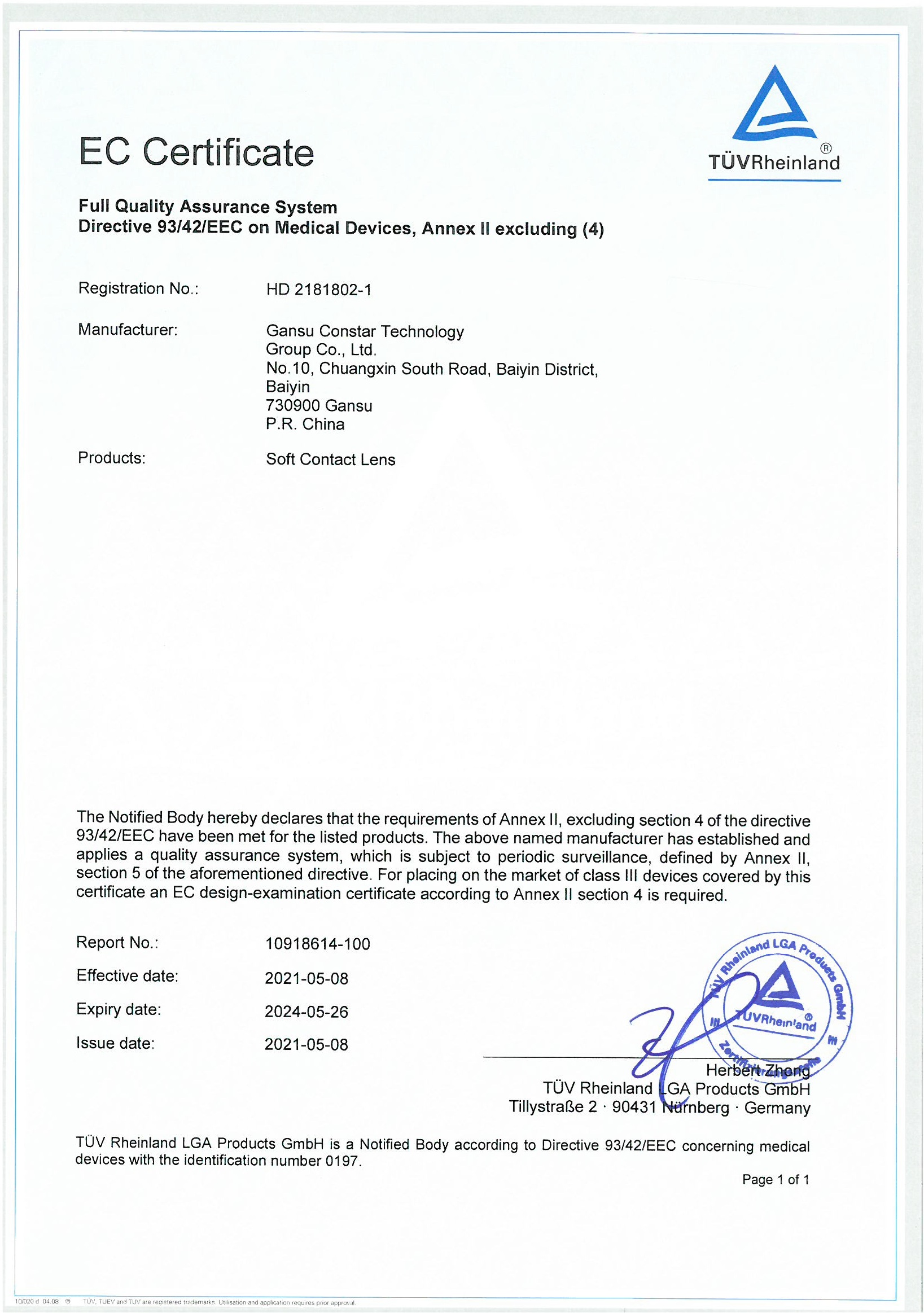 GIẤY CHỨNG NHẬN EC ĐẠT TIÊU CHUẨN CHẤT LƯỢNG CHÂU ÂU - LUNA EYES
