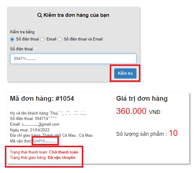 Nhấp vào mục theo dõi đơn hàng và điền số điện thoại hoặc email đăng kí đơn hàng để kiểm tra sau đó hệ thống sẽ tự động hiển thị trạng thái và thông tin của đơn hàng.